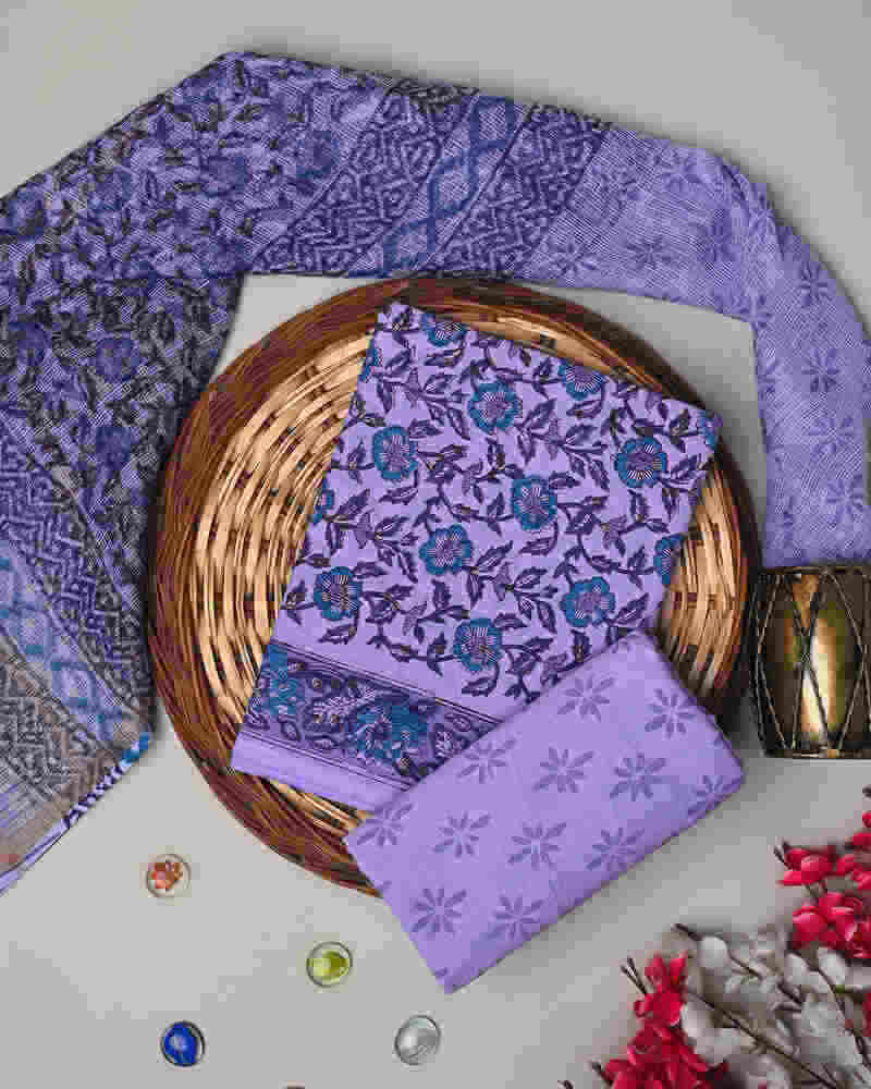 Shop this elegant blue and black shibori cotton suit with Kota Doria dupatta. Perfect for ethnic wear lovers. Buy online today at Ethnic Adda.