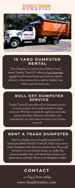 Need reliable commercial dumpster rental services for your job site or business? Family Trash SC provides the right containers and support for every commercial need—big or small. We help contractors, property managers, and business owners streamline waste removal with weekly pickups, flexible timelines, and competitive pricing. Keep your workspace clean and safe with a partner you can trust.