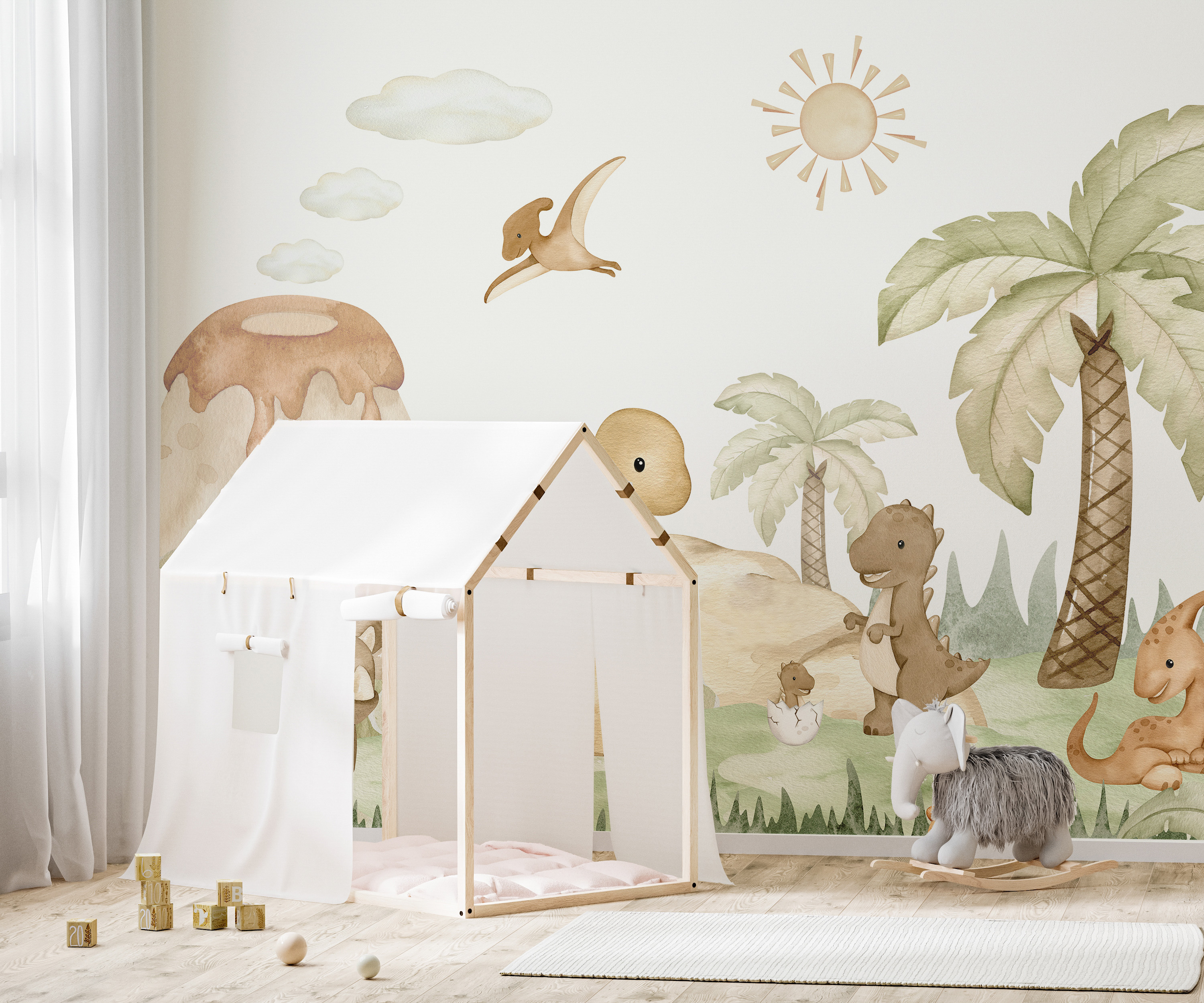 Roar into adventure with our adorable cute dinosaur wallpaper! Featuring a cast of friendly, smiling T-Rexes, Stegosauruses, and Brontosauruses in a playful, prehistoric landscape. This charming and colorful design sparks imagination and creates a joyful space, perfect for any kid’s room or nursery.