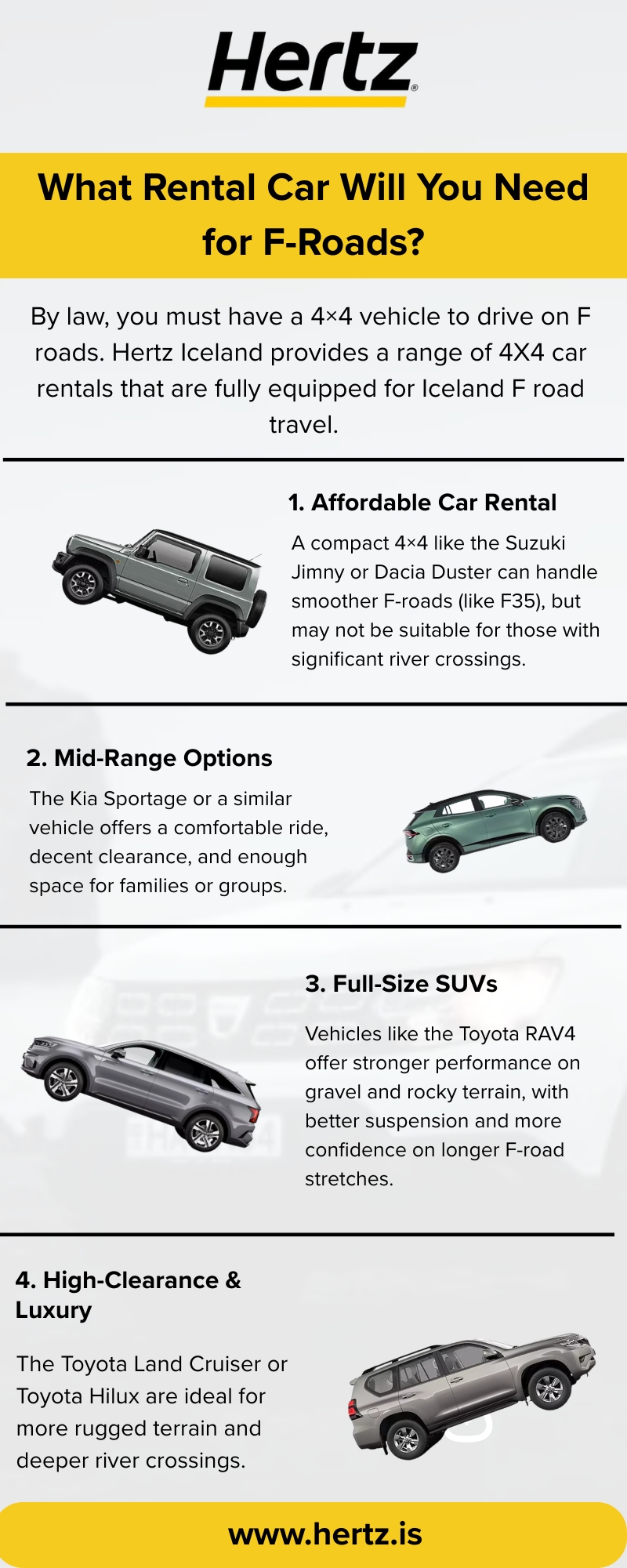 Planning a journey through Iceland’s highlands? Learn how to navigate F roads in Iceland with expert advice from Hertz Iceland. Understand F-Road rules, seasonal access, and why a 4×4 vehicle is essential. Trust Hertz Iceland for reliable rentals and highland-ready vehicles.