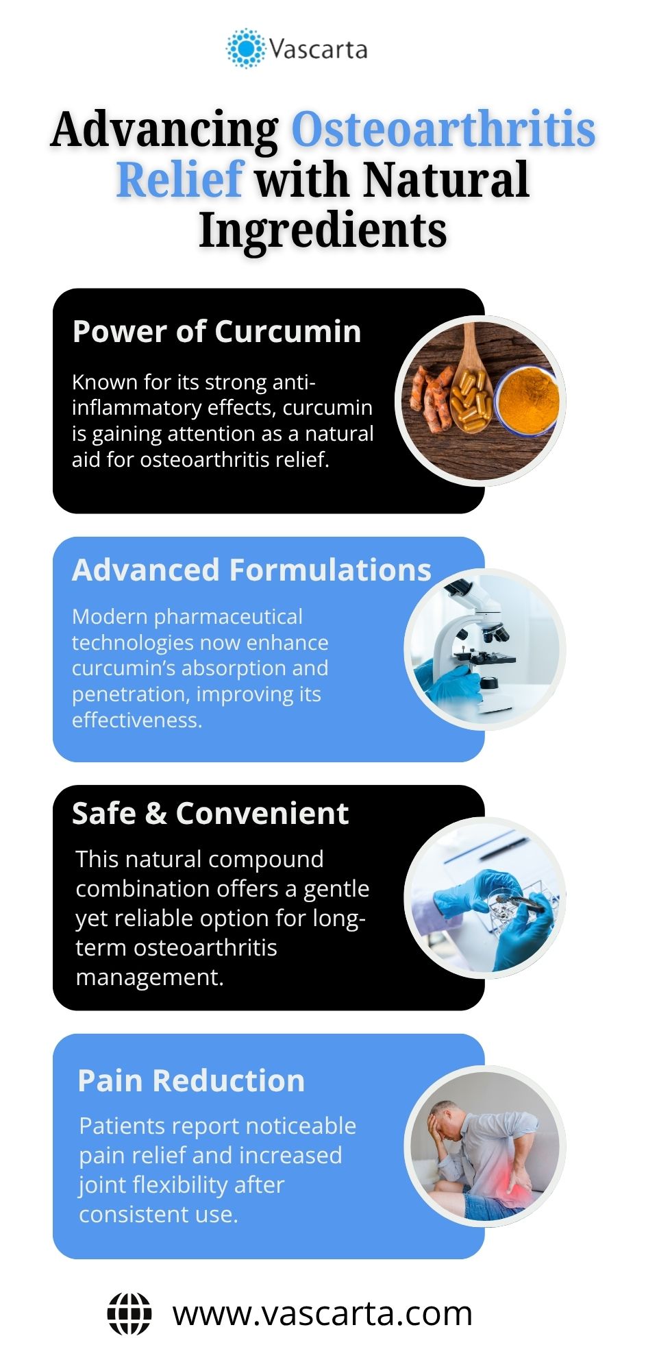 At Vascarta Inc., we create natural medications for osteoarthritis using compounds like curcumin. Our treatments help reduce joint pain and stiffness while improving mobility. With advanced delivery technology, our medications work better in the body and are safe for long-term use. Many of our patients notice less discomfort and better flexibility. We combine nature and science to provide practical solutions for healthier, active joints.