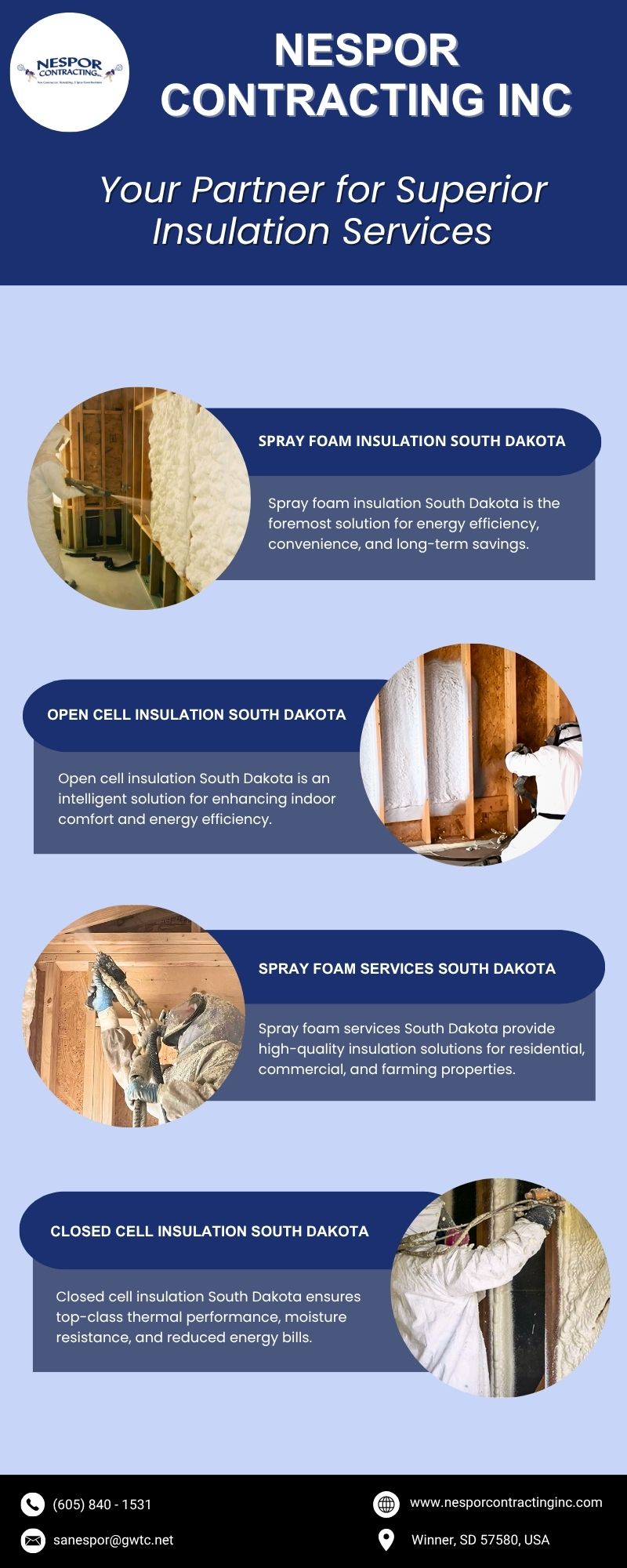 Nespor Contracting Inc stands out as an ideal source of Spray foam insulation services South Dakota, offering long-lasting performance and improved energy efficiency. We proudly serve residential, commercial, and agricultural properties, offering high-density spray foam designed to seal air leaks, raise indoor comfort, and lower power bills. Our professional team uses cutting-edge equipment and proven methods to assure precise, climate-specific insulation results throughout South Dakota. For trustworthy and proficient spray foam solutions, trust Nespor Contracting Inc. Visit us today.
