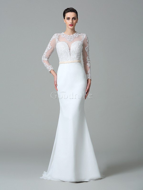 Robe de mariée longue en satin au niveau de cou de sirène avec manche longue – GoodRobe