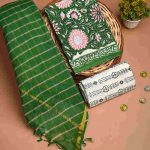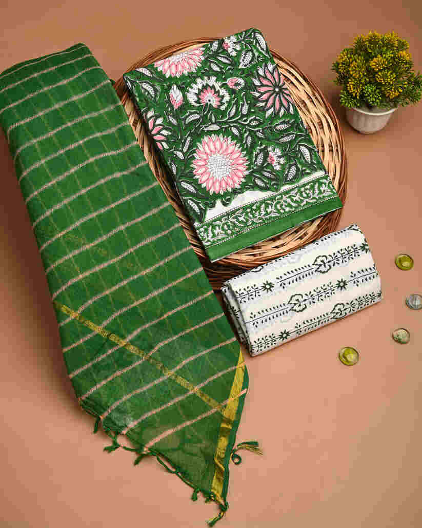 Get this Premium Pink Cotton Suit with exquisite Sanganeri print and Kota Doria Dupatta. Perfect blend of tradition and style.
