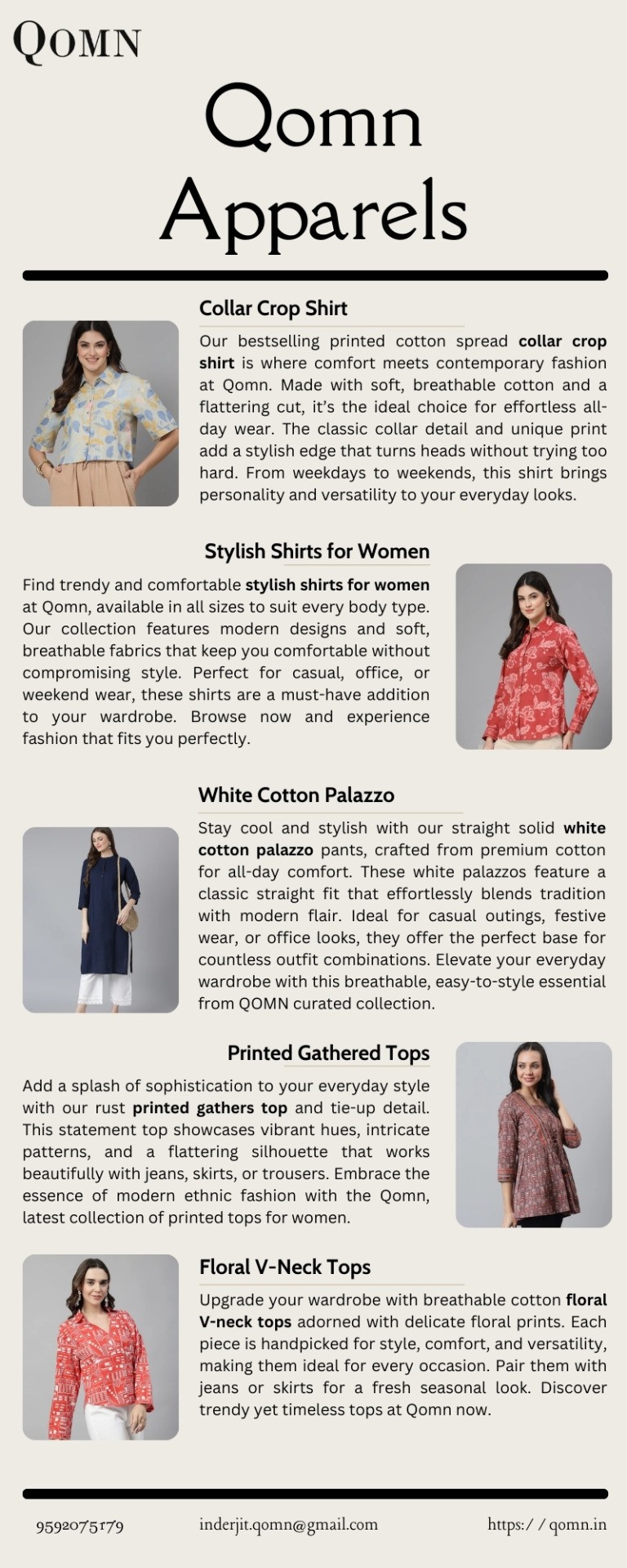 Upgrade your wardrobe with breathable cotton floral V-neck tops adorned with delicate floral prints. Each piece is handpicked for style, comfort, and versatility, making them ideal for every occasion. Pair them with jeans or skirts for a fresh seasonal look. Discover trendy yet timeless tops at Qomn now.
