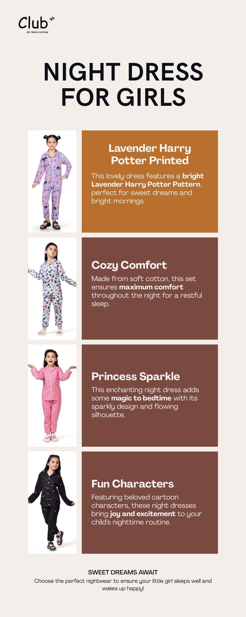 Discover the cutest collection of Night Dress for Kids Girls at Club 96. From cozy cotton comfort to fun cartoon prints and enchanting princess styles, our nightwear ensures restful sleep and happy mornings. Perfectly designed for style, comfort, and joy, these dresses make bedtime magical for your little girl. Explore our exclusive kids’ night dress collection today and bring sweet dreams home.