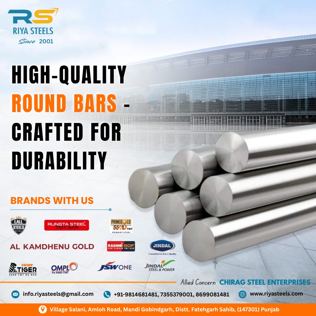 Riya Steels is a leading Round Bars Manufacturer in Punjab, known for delivering premium-quality and durable steel bars for industrial and construction needs. With top brands like JSW, Jindal, Kamdhenu, and more, we ensure superior strength, precision, and reliability in every product.
